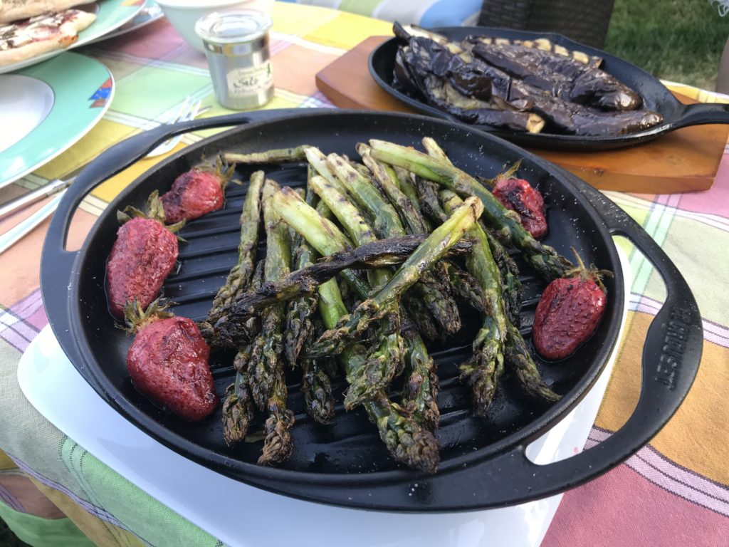 Hier oben seht ihr jedenfalls gegrillte Aubergine, Spargel und Erdbeeren sowie vegane „Schnitzel“ von der Marke like meat. Eurer Fantasie sind natürlich keine Grenzen gesetzt. (Vegetarische/Vegane) Würstchen (Z. B. von oben genannter Marke), Minipizzen, wenn ihr einen Pizzastein habt, anderes Obst als Nachtisch… man kann sogar Kuchen auf dem Grill zubereiten.
